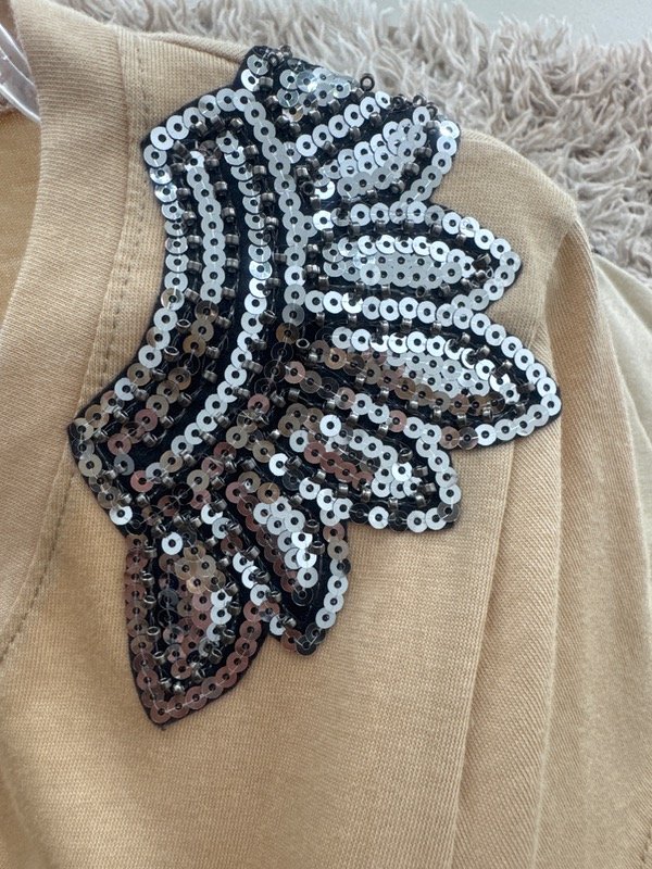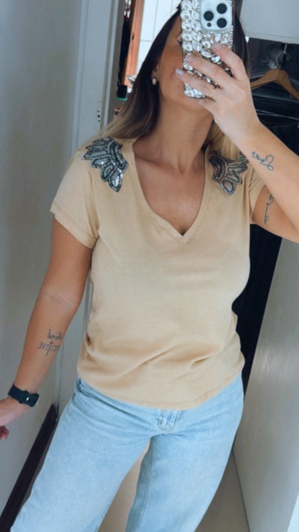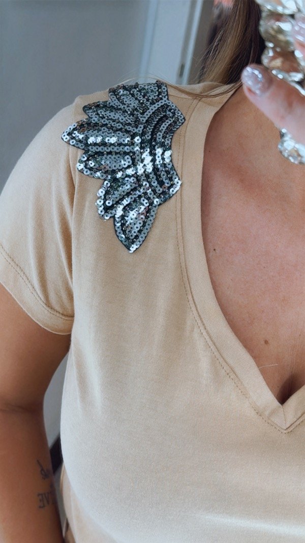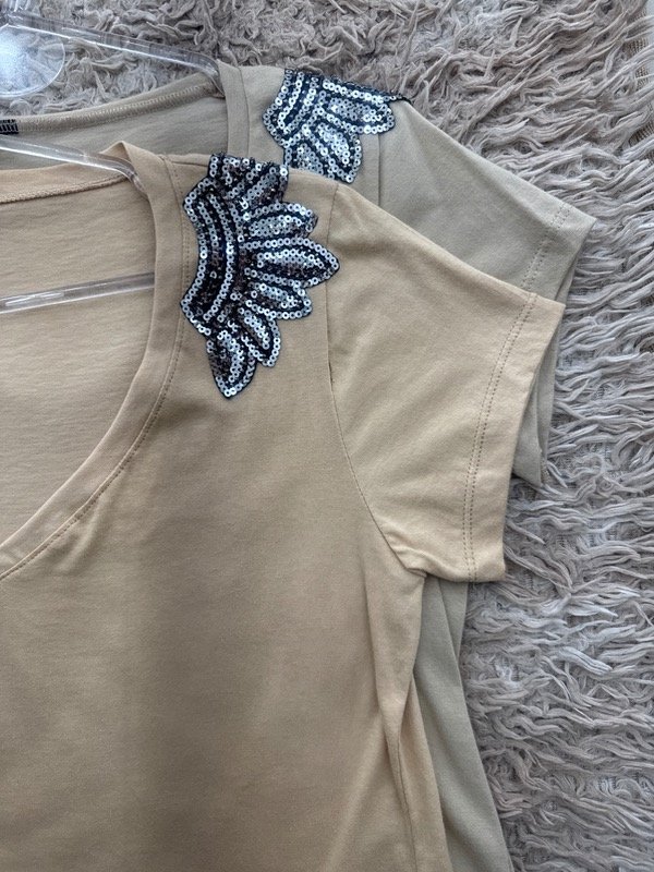 Algodón Peinado. Aplique de lentejuelas. Escote V